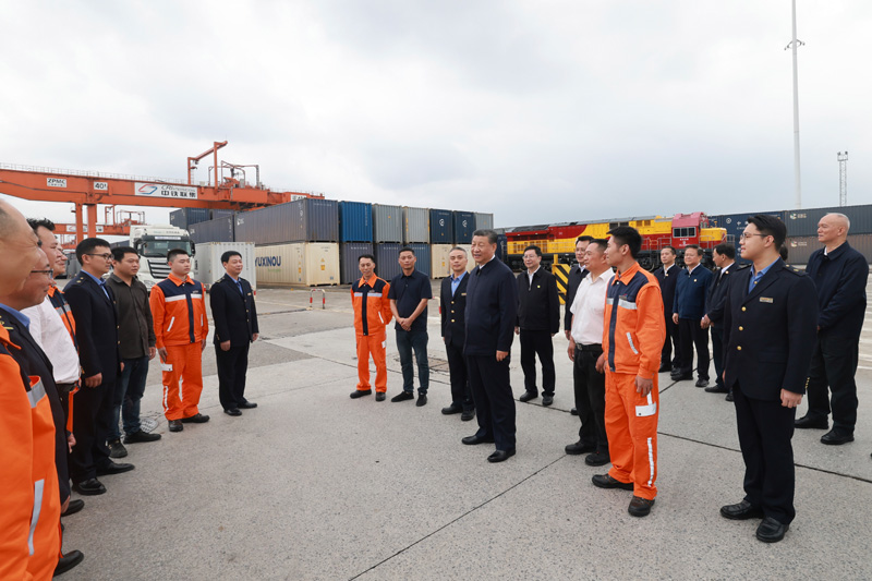 4月22日至24日,中共中央總書(shū)記、國(guó)家主席、中央軍委主席習(xí)近平在重慶考察。這是22日下午,習(xí)近平在重慶國(guó)際物流樞紐園區(qū)重慶鐵路集裝箱中心站,同貨車司機(jī)、列車司機(jī)、裝卸工人、場(chǎng)站管理人員等親切交流。新華社記者 岳月偉 攝