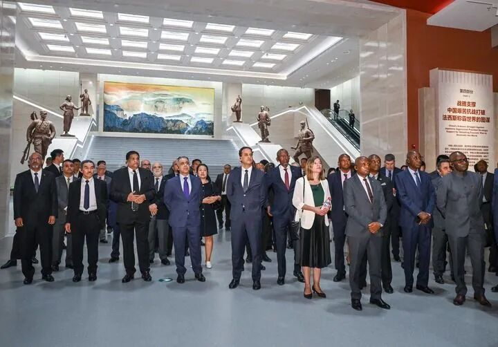 駐華外交官來到中國人民抗日戰爭紀念館,參觀紀念中國人民抗日戰爭暨世界反法西斯戰爭勝利80周年主題展覽《為了民族解放與世界和平》(2025年7月17日攝)。新華社記者 陳曄華 攝