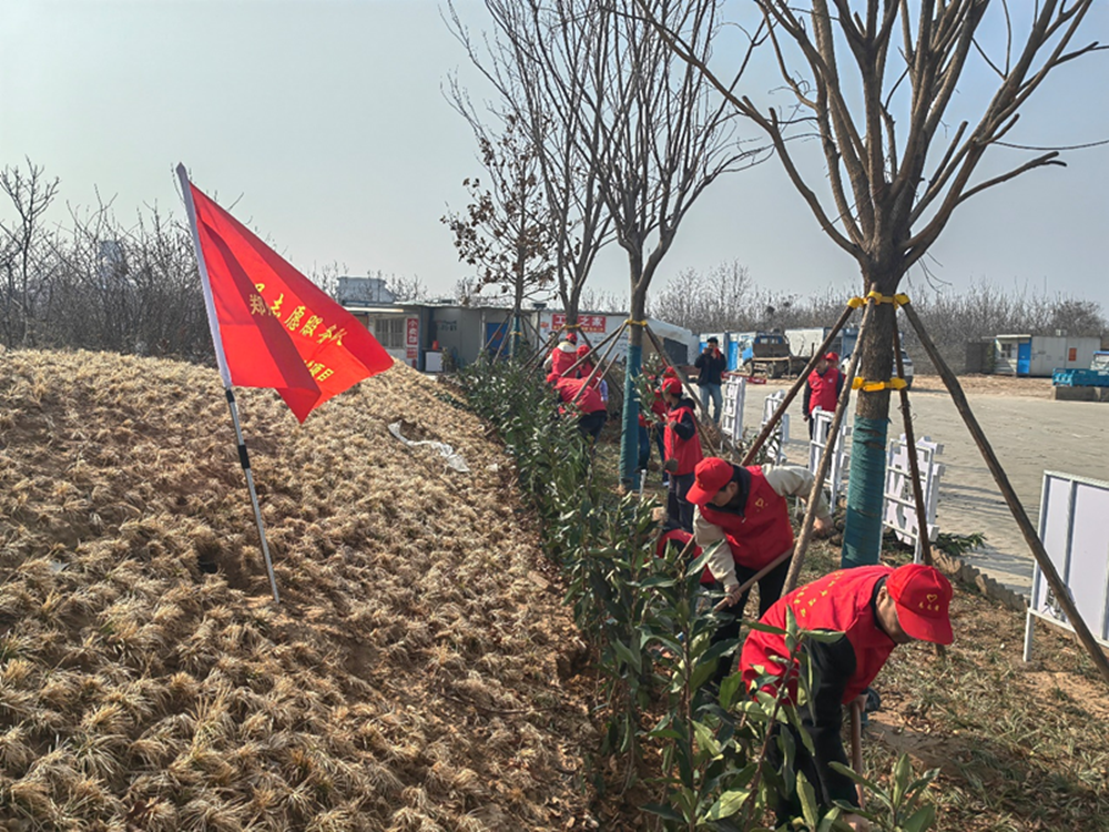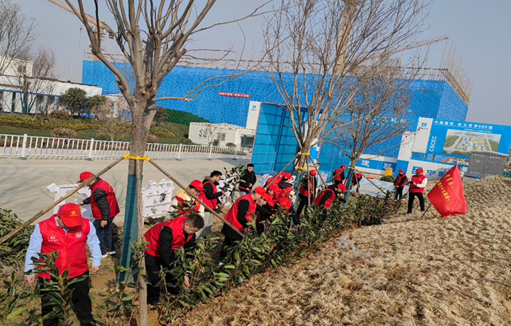 黨員志愿服務(wù)隊人員分工明確,配合默契。挖坑、搬運、植樹、培土澆水,井井有條,忙而不亂。在志愿者的共同努力下,細心栽下碧綠的樹苗,在暖暖的陽光下格外顯眼,仿佛為項目披上一層新裝。