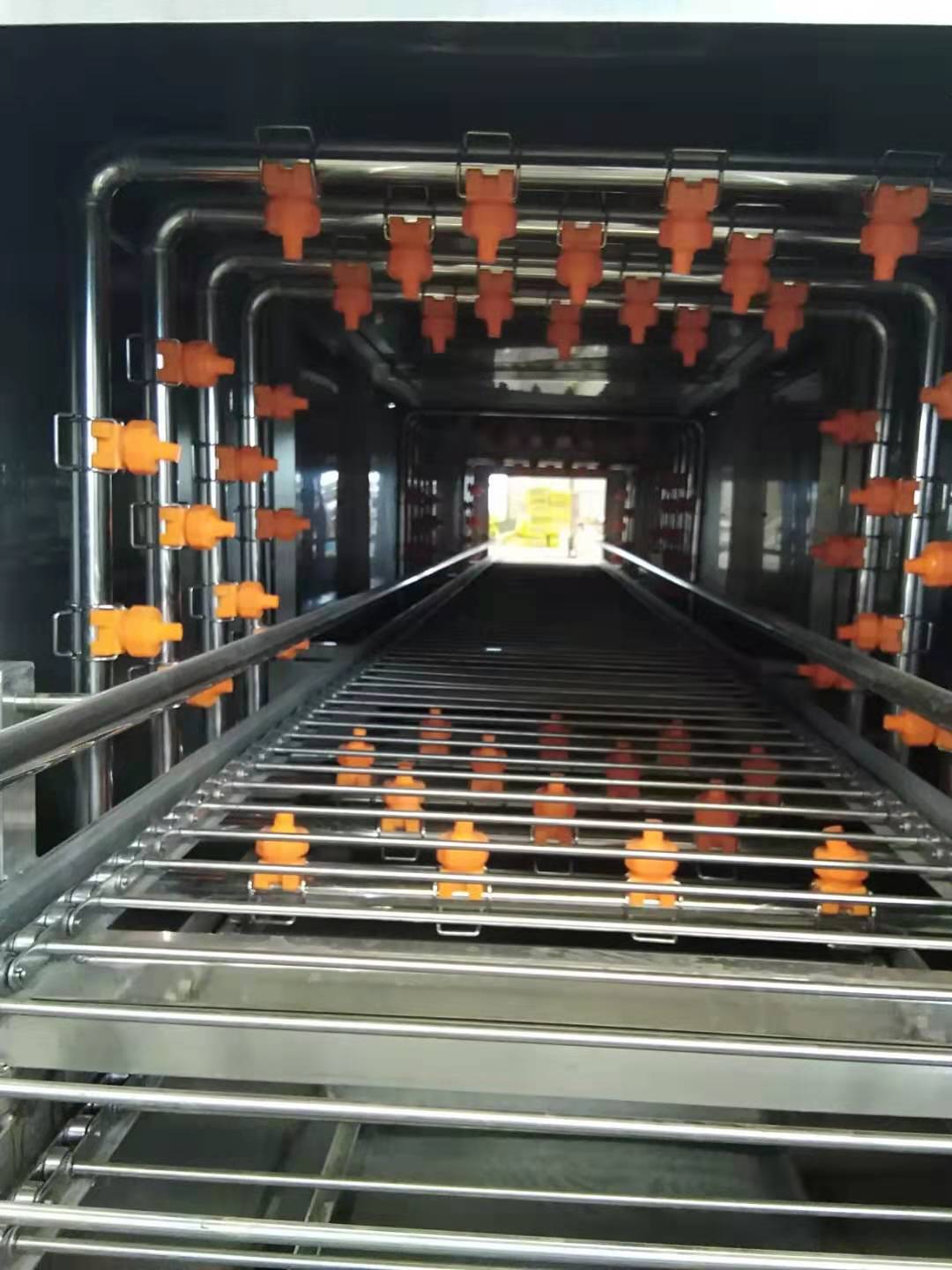 洗框機(jī)分多短時(shí),每段配有獨(dú)立的循環(huán)泵、水箱和噴淋管。這樣每段為一個(gè)獨(dú)立的清洗系統(tǒng),可根據(jù)實(shí)際情況運(yùn)行其中一段或幾段;個(gè)水箱上配有濾網(wǎng),可實(shí)現(xiàn)水的循環(huán)利用;噴淋管上配有噴頭,可自動(dòng)調(diào)節(jié)方向,從而實(shí)現(xiàn)無死角噴淋水,使周轉(zhuǎn)筐沖洗更干凈。